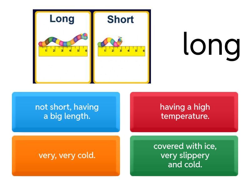 1) long a) not short, having a big length. b) having a high temperature. c) very, very cold. d) covered with ice, very slippery and cold. 2) hot a) not short, having a big length. b) having a high temperature. c) very, very cold. d) covered with ice, very slippery and cold. 3) freezing a) not short, having a big length. b) having a high temperature. c) very, very cold. d) covered with ice, very slippery and cold. 4) icy a) covered with ice, very slippery and cold. b) without water, not wet. c) very, very big. d) big from side to side. 5) dry a) covered with ice, very slippery and cold. b) without water, not wet. c) very, very big. d) big from side to side. 6) huge a) covered with ice, very slippery and cold. b) without water, not wet. c) very, very big. d) big from side to side. 7) wide a) covered with ice, very slippery and cold. b) without water, not wet. c) very, very big. d) big from side to side. 8) wet a) covered with water or liquid. b) very nice to look at. c) hot and wet in the air. d) a little cold, but not freezing. 9) beautiful a) covered with water or liquid. b) very nice to look at. c) hot and wet in the air. d) a little cold, but not freezing. 10) humid a) covered with water or liquid. b) very nice to look at. c) hot and wet in the air. d) a little cold, but not freezing. 11) cool a) covered with water or liquid. b) very nice to look at. c) hot and wet in the air. d) a little cold, but not freezing. 12) warm a) not hot, not cold, comfortable temperature. b) to go and find out about a new place. c) the path one object takes around another, like the Earth around the Sun. d) to hold something up, to help. 13) explore a) not hot, not cold, comfortable temperature. b) to go and find out about a new place. c) the path one object takes around another, like the Earth around the Sun. d) to hold something up, to help. 14) orbit a) not hot, not cold, comfortable temperature. b) to go and find out about a new place. c) the path one object takes around another, like the Earth around the Sun. d) to hold something up, to help. 15) support a) not hot, not cold, comfortable temperature. b) to go and find out about a new place. c) the path one object takes around another, like the Earth around the Sun. d) to hold something up, to help. 16) 16. discover a) to find something new. b) dangerous if eaten, touched, or breathed. c) not short, having a big length. d) having a high temperature. 17) 17. poisonous a) to find something new. b) dangerous if eaten, touched, or breathed. c) not short, having a big length. d) having a high temperature.