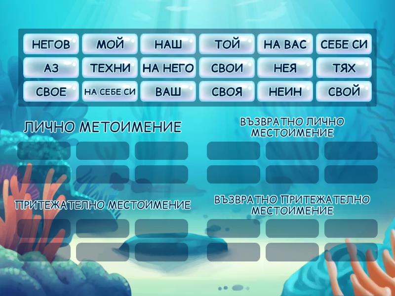 ЛИЧНО МЕТОИМЕНИЕ: НА НЕГО, АЗ, ТЯХ, НА ВАС, НЕЯ, ТОЙ, ВЪЗВРАТНО ЛИЧНО МЕСТОИМЕНИЕ: СЕБЕ СИ, НА СЕБЕ СИ, ПРИТЕЖАТЕЛНО МЕСТОИМЕНИЕ: НАШ, ВАШ, НЕГОВ, ТЕХНИ, НЕИН, МОЙ, ВЪЗВРАТНО ПРИТЕЖАТЕЛНО МЕСТОИМЕНИЕ: СВОЙ, СВОЕ, СВОЯ, СВОИ,