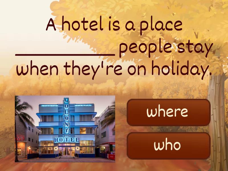 1) A hotel is a place __________ people stay when they're on holiday. a) where b) who 2) What's the name of the woman __________ lives in that house? a) who b) where 3) What is the name of a girl __________ is sitting next to Ruvim? a) where b) who 4) A dentist is a person __________ helps people with teeth. a) who b) where 5) Is that the shop __________ you buy books? a) who b) where 6) He's the man __________ plays football with my dad. a) who b) where 7) This is a room, _________ I usually do my homework. a) who b) where 8) Look! That is a teacher, _________ can play a guitar. a) who b) where 9) I like the lessons, _________ we play games a) where b) who