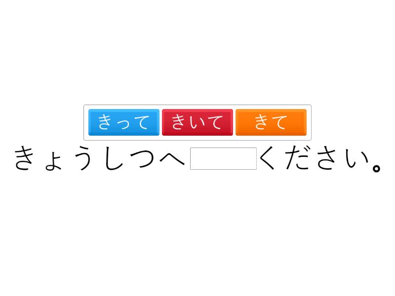 きょうしつへ ____ください。 すぐ じむしょへ ____ください。 レポートを ____ください。 おちゃを ____います。 テレビを ____ください。 ドアを ____ください。 ____ きてください。 ぎんこうの まえ____ とめてください。 雪____ ふっています。 学校____ むかえに行きます。
