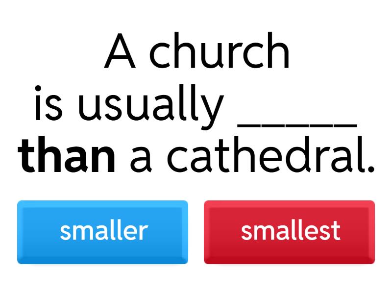 1) A church is usually _____ than a cathedral. a) smaller b) smallest 2) This pub is the ______ in our village. a) busiest b) busier 3) This is one of the _____ clubs in town. a) coolest b) most cool c) cooler 4) My mobile phone is _______ than yours. a) most expensive b) more expensive 5) Paris is ______ than London today. a) more hot b) hotter 6) Is living in the country _________ than living in a city? a) most boring b) more boring 7) St Paul’s is the_______cathedral in England. a) more famous b) most famous