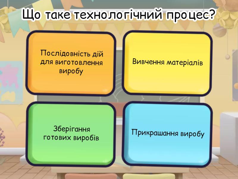 1) Що таке технологічний процес? a) Послідовність дій для виготовлення виробу b) Вивчення матеріалів c) Зберігання готових виробів d) Прикрашання виробу 2) Який матеріал належить до природних? a) Пластмаса b) Штучна шкіра c) Деревина d) Силікон 3) Який інструмент використовують для розмічання на тканині? a) Молоток b) Крейда або спеціальний олівець c) Напилок d) Викрутка 4) Що показує креслення виробу? a) Його колір b) Вартість c) Форма, розміри та деталі d) Матеріал 5) Яке з наведених тверджень є правилом безпечної праці? a) Працювати поспіхом b) Передавати ножиці відкритими лезами c) Зберігати інструменти на своєму місці d) Використовувати будь-який інструмент як заманеться 6) Яка властивість характерна для тканини з бавовни? a) Не вбирає вологу b) Легко мнеться c) Плавиться при нагріванні d) Є еластичною 7) Що означає слово «біоформа» у дизайні виробу? a) Використання форм, створених природою b) Копіювання машин c) Використання лише металу d) Вироби тільки квадратної форми 8) Для чого використовують викрійку? a) Щоб визначити колір тканини b) Для правильного розкроювання деталей виробу c) Для оздоблення d) Для пакування виробу 9) Яка послідовність виготовлення виробу правильна? a) Оздоблення → Проєктування → Виконання b) Проєктування → Виконання → Оздоблення c) Виконання → Проєктування → Зберігання d) Зберігання → Оздоблення → Виконання 10) Який інструмент використовують для шліфування деревини? a) Лінійка b) Напилок або наждачний папір c) Крейда d) Циркуль