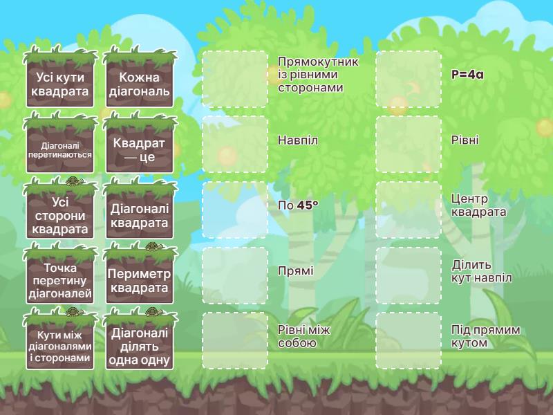 Усі сторони квадрата - Рівні між собою, Усі кути квадрата - Прямі, Периметр квадрата - P=4a, Діагоналі квадрата - Рівні, Діагоналі перетинаються - Під прямим кутом, Діагоналі ділять одна одну - Навпіл, Точка перетину діагоналей - Центр квадрата, Кожна діагональ - Ділить кут навпіл, Квадрат — це - Прямокутник із рівними сторонами, Кути між діагоналями і сторонами - По 45°,