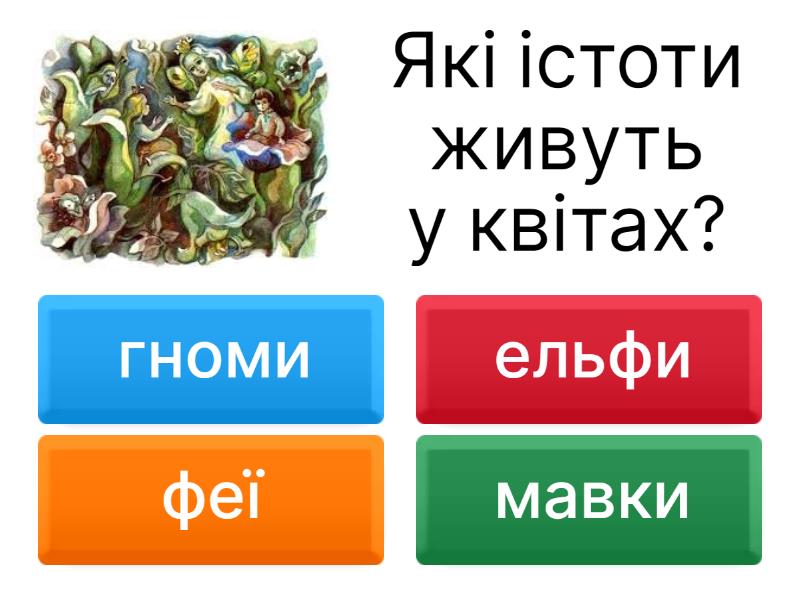 1) Які істоти живуть у квітах? a) гноми b) ельфи c) феї d) мавки 2) Лелія - це... a) наймудріша ельфа b) найкраща ельфа c) найстарша ельфа d) найемоційніша ельфа 3) На яку квітку перетворився Павлусь? a) біла лілія b) рожевий мак c) червона троянда d) біла ромашка 4) Куди вирушили Павлусь з Лелією? a) у ліс b) на гору c) у поле d) у панський садок 5) На що НЕ жалілися лілії? a) обривають їм листя b) їм заважають бенкети паничів c) укорочують їм віку гострим ножем d) сонце палить їхні пелюстки 6) Чому панночка була не задоволена? a) до неї не приїхали друзі b) їй було нудно c) не подобалася погода d) не виспалася 7) Куди зникла наймолодша сестра Лелії? a) її випросила дівчина Мар’яна b) зрізали на бенкет c) затоптали паничі d) зів'яла від спеки 8) Куди продовжили подорож Лелія з Павлусем після відвідин панського саду? a) у ліс b) до міста c) у гори d) у село 9) На що нарікали дівчата у квітковому магазині ? a) були нестерпні умови праці b) низька заробітня плата c) не любили квіти d) їм було нудно 10) Хто така Мар'яна? a) працівниця квіткового магазину b) панночка c) сусідка Павлуся d) сестра Лелії 11) Хто з героїв твору не має дорогих речей, але цінує любов родини та помічає красу? a) Панночка b) Лелія c) Мар’яна d) Івась 12) Хто з героїв твору живе в розкошах і не помічає свого щастя? a) Мар’яна b) Панночка c) Івась d) Лелія