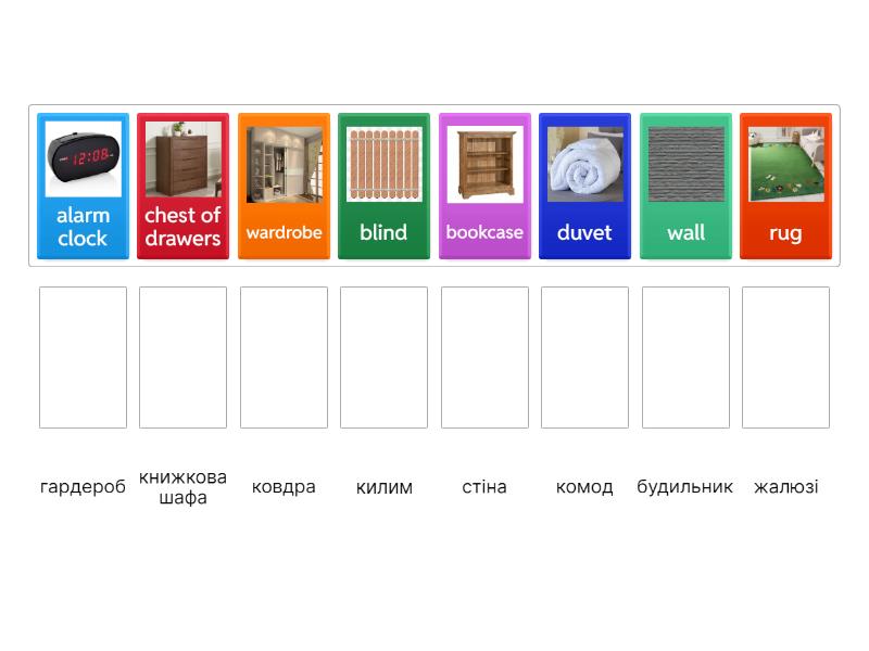 alarm clock - будильник, armchair - крісло, blind - жалюзі, bookcase - книжкова шафа, balcony - балкон, wall - стіна, chest of drawers - комод, curtains - штори, mirror - дзеркало, pillow - подушка, wardrobe - гардероб, cushions - подушки (декоративні), rug - килим , duvet - ковдра, vase - ваза,