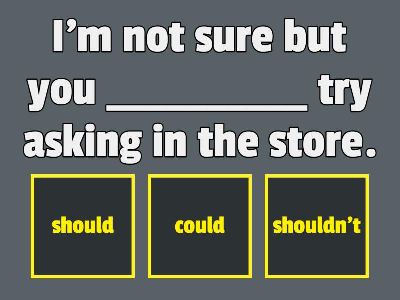 1) I'm not sure but you __________ try asking in the store. a) should b) could c) shouldn't 2) My cellphone is very slow. I ____________ clik on that strange link offering 200$. a) should b) could c) shouldn't 3) It is 9:30 already. We _______________ leave right now. a) should b) could c) shouldn't 4) I studied all the night. I ______ aprove the test surely. a) will b) might c) won't 5) Sara is busy today. She had a meeting at 9:00. She ______ come to the party. a) will b) might c) won't 6) We practice on the weekend. we got good results. Even the other team is better than us, I think we _______ have a chance to win the match. a) will b) won't c) might 7) I _______ to hand my projet due to 9:00 am of tomorrow. a) have b) need 8) Human beings ________ to breath oxigen. a) have b) need 9) We __________ to take some fruit to the school to practice vocabulary in English class. a) have b) need