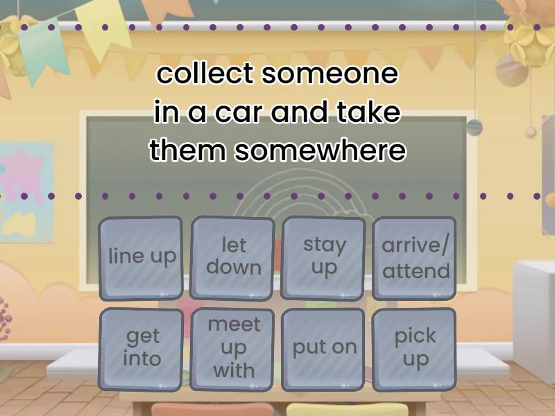 pick up - collect someone in a car and take them somewhere, meet up with - get together with another person/ other people to spend time with them, put on - apply to your face/ dress yourself in sth, get into - get a place (on a course, at college), stay up - not go to bed, line up - form a queue or wait behind the person in front , let down - make someone feel disappointed by not doing sth they expect you to do, arrive/ attend - turn up,