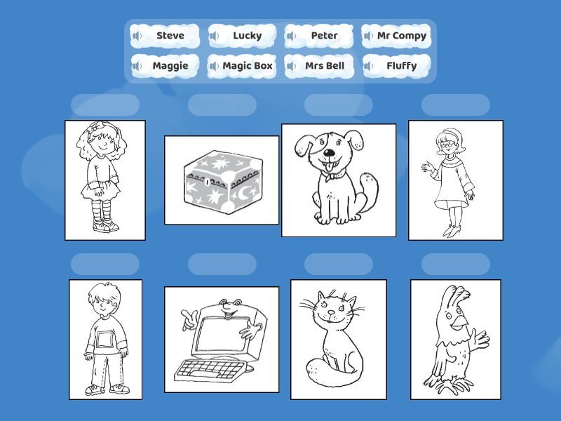 Mrs Bell, Maggie, Steve, Peter, Fluffy, Lucky, Mr Compy, Magic Box,