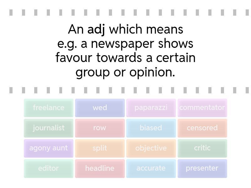 biased - An adj which means e.g. a newspaper shows favour towards a certain group or opinion., headline - The title of a newspaper article, usually printed in big letters., objective - Not influenced by personal opinions or feeling., journalist - Somebody who writes for a newspaper or magazine., paparazzi - Photographers who follow celebrities and sell the photos they've taken of them., wed - A verb used in newspaper headlines which means to marry., freelance - Journalists who sell work to different newspapers, but don't work for any particular one are this., censored - If a newspaper article is considered offensive or immoral, it might get ________., agony aunt - This kind of journalist can help you with your problems if you write to her., accurate - A story which is correct and has got the facts right can be described with this adjective., row - A word used in headlines which means the same as an argument., split - A verb used in headlines which means that a couple has broken up., critic - A journalist who expresses opinions about music, books, films, etc., commentator - A person who works on the radio and describes e.g. a sporting event while it's happening., presenter - A person who works on TV and introduces a programme., editor - This person decides what goes into a newspaper and what shouldn't.,
