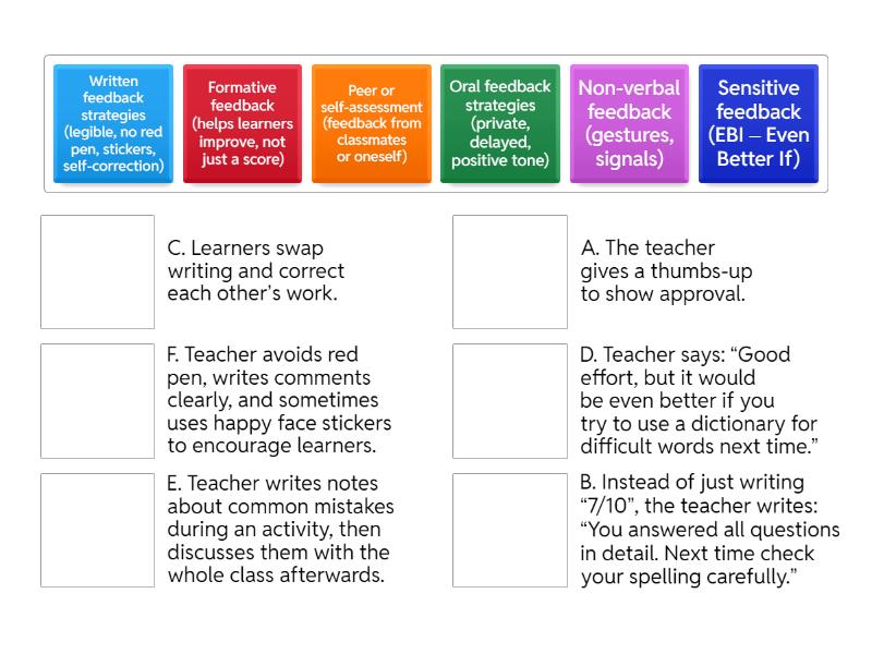 Non-verbal feedback (gestures, signals) - A. The teacher gives a thumbs-up to show approval., Formative feedback (helps learners improve, not just a score) - B. Instead of just writing “7/10”, the teacher writes: “You answered all questions in detail. Next time check your spelling carefully.”, Peer or self-assessment (feedback from classmates or oneself) - C. Learners swap writing and correct each other’s work., Sensitive feedback (EBI – Even Better If) - D. Teacher says: “Good effort, but it would be even better if you try to use a dictionary for difficult words next time.”, Oral feedback strategies (private, delayed, positive tone) - E. Teacher writes notes about common mistakes during an activity, then discusses them with the whole class afterwards., Written feedback strategies (legible, no red pen, stickers, self-correction) - F. Teacher avoids red pen, writes comments clearly, and sometimes uses happy face stickers to encourage learners.,