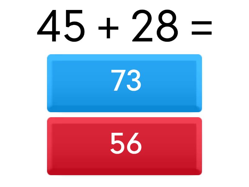 1) 45 + 28 = a) 73 b) 56 2) 90 − 37 = a) 53 b) 62 3) 6 × 8 = a) 58 b) 48 c) 30 d) 25 e) 54 f) 412 4) 81 ÷ 9 = a) 9 b) 6