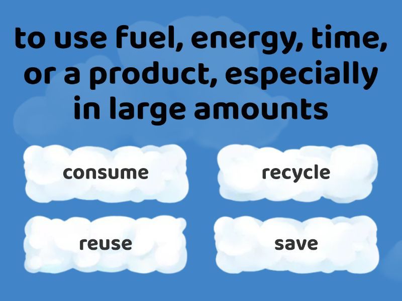 1) to use fuel, energy, time, or a product, especially in large amounts a) consume b) recycle c) reuse d) save 2) convert (waste) into reusable material. a) consume b) waste c) recycle d) throw away 3) make smaller or less in amount, degree, or size a) save b) reduce c) reuse d) consume 4) use again or more than once a) recycle b) save c) waste d) reuse 5) keep and store up (something, especially money) for future use a) waste b) throw away c) save d) consume 6) discard something as useless or unwanted a) throw away b) consume c) reuse d) waste 7) use or expend carelessly, extravagantly, or to no purpose a) waste b) consume c) throw away d) reduce