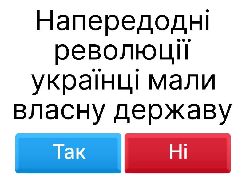 1) Напередодні революції українці мали власну державу a) Так b) Ні 2) В які роки відбувалась Українська революція? a) 1917-1918 b) 1918-1919 c) 1917-1919 d) 1917-1921 3) Яка подія стала поштовхом до Української революції? a) Перша світова війна b) Прихід до влади в росії більшовиків c) Лютнева революція в росії d) Завершення Першої світової війни поразкою росії 4) Що важливого відбулося в цій будівлі? a) Почалася лютнева революція в росії b) Було створено УЦР c) Всеукраїнський національний конгрес d) Створено перший український полк 5) Українська Центральна Рада під час революції виконувала ту саму роль, яку сьогодні виконує … a) Президент b) Кабінет Міністрів c) Верховна Рада 6) В цій будівлі під час революції … a) Розмістилась УЦР b) Засідав Генеральний Секретаріат c) Жив М Грушевський d) Була створена УЦР 7) Автономія - це … a) форма правління, коли влада належить одній особі. b) союз кількох держав, що мають спільні кордони та армію. c) повна незалежність держави від інших країн. d) Це право частини держави самостійно вирішувати певні питання свого внутрішнього життя 8) Після якої події УЦР стала загальнонаціональним представницьким органом a) Всеукраїнський національний конгрес b) Віче на Софійській площі c) Створення Першого українського полку d) Лютневої революції в росії 9) Який факт про особу на фото помилковий? a) Його називають «батьком історії України» b) Його було обрано головою УЦР c) Росіяни відправили його у заслання за автрофільство під час війни d) Всі варіанти правильні 10) В світі існує більше держав ніж націй a) Так b) Ні 11) Чиє ім´я носив перший український полк створений під час революції? a) П Полуботка b) М Грушевського c) П Сагайдачного d) Б Хмельницького