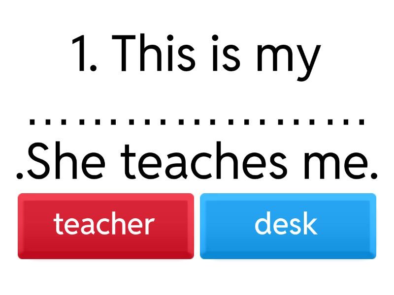 1) 1. This is my ………………… .She teaches me. a) desk b) teacher 2) 2. When I meet my friend I say ………………… . a) Hello b) good night 3) 3. There are two ………………… in my bag. a) pencil b) pencils 4) 4. I write my name on the ………………… . a) board b) chair 5) 5.Open your………………… a) desk b) book 6) 6. Ahmed and Hana ………………….hands. a) shake b) make 7) 7. Nice to ………………… you. a) meat b) meet 8) 8. ......................... your name? a) Where's b) What's 9) 9. …………………! I am Nada. a) Goodbye b) Hello 10) 10. It is .................... insect. a) a b) an