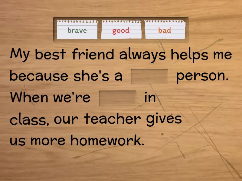 My best friend always helps me because she's a ____ person. When we're ____ in class, our teacher gives us more homework. My little brother is so ____ ! He talks about trains all the time. Sofia tells me lots of great things I don't know - she's very ____ When I'm ____, my mum always asks me how she can help. My dad laughs a lot because he's a very ____ person. My sister is ____ because she gives me clothes and make-up. Nobody in our class is ____ - we are all good friends. My little brother isn't very ____ - he can't stand waiting for things. People often say things that aren't ____ when they're angry with someone. People are ____ when they do things which they don't want to do. Ava's really ____ _ she's got 890 friends on social media! Everyone loves Martina - she's really ____. I'm a very ____ person. I always say exactly what I think.
