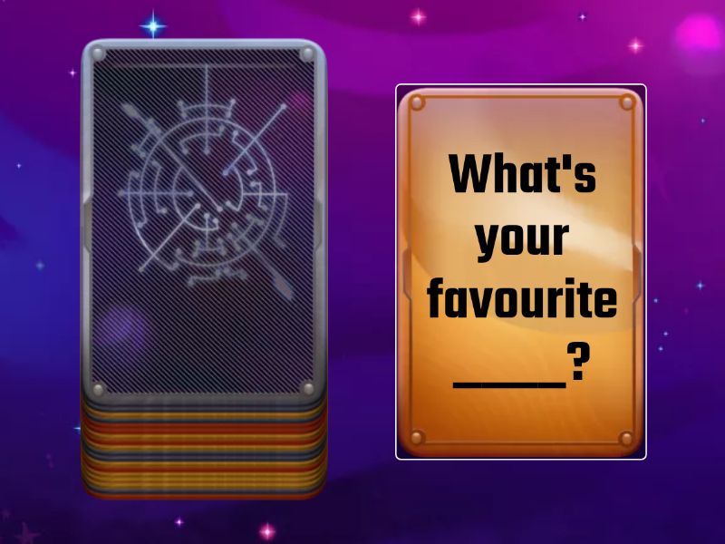 What's your ___ ?, What's ___ name?, ___ your name?, How old are ___?, How old ___ you?, How ___ are you?, ___ old are you?, Where are you ___?, Where are ___ from?, Where ___ you from?, ___ are you from?, What's your ___ film?, What's ____ favourite film?, ____ your favourite film?, What's your favourite ____?, Who's your favourite ____?, Who's your ___ singer?, Who's ____ favourite singer?, ___ your favourite singer?.