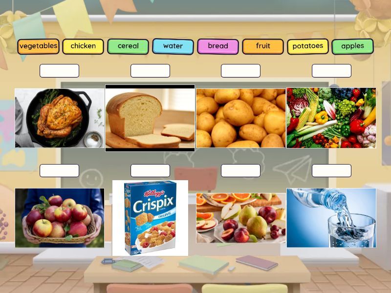 apples, biscuits, bread, cereal, cheese, chicken, chips, fish, fruit, ham, meat, juice, pancakes, pasta, potatoes, rice, salad, sandwiches, sausages, tomatoes, tuna, vegetables, water, yoghurt,