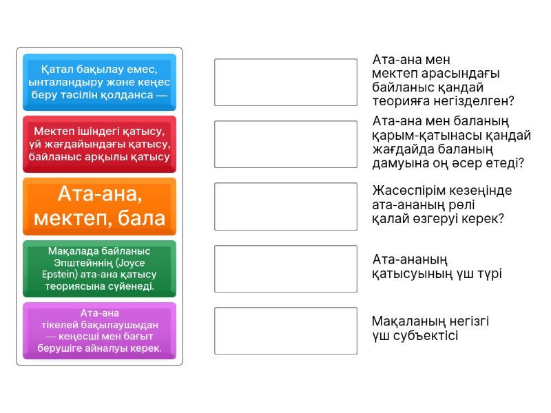 Ата-ана, мектеп, бала - Мақаланың негізгі үш субъектісі, Мақалада байланыс Эпштейннің (Joyce Epstein) ата-ана қатысу теориясына сүйенеді. - Ата-ана мен мектеп арасындағы байланыс қандай теорияға негізделген?, Мектеп ішіндегі қатысу, үй жағдайындағы қатысу, байланыс арқылы қатысу - Ата-ананың қатысуының үш түрі, Қатал бақылау емес, ынталандыру және кеңес беру тәсілін қолданса — - Ата-ана мен баланың қарым-қатынасы қандай жағдайда баланың дамуына оң әсер етеді?, Ата-ана тікелей бақылаушыдан — кеңесші мен бағыт берушіге айналуы керек. - Жасөспірім кезеңінде ата-ананың рөлі қалай өзгеруі керек?,