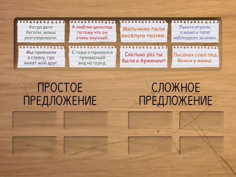ПРОСТОЕ ПРЕДЛОЖЕНИЕ: Мальчики пели весёлую песню., Лисёнок спал под боком у мамы., С горы открывался прекрасный вид на город., Сколько раз ты была в Армении?, СЛОЖНОЕ ПРЕДЛОЖЕНИЕ: Львята играли, а мама и папа наблюдали за ними., Когда дети бегали, мамы разговаривали., Я люблю шоколад, потому что он очень вкусный., Мы приехали в страну, где живёт мой друг.,