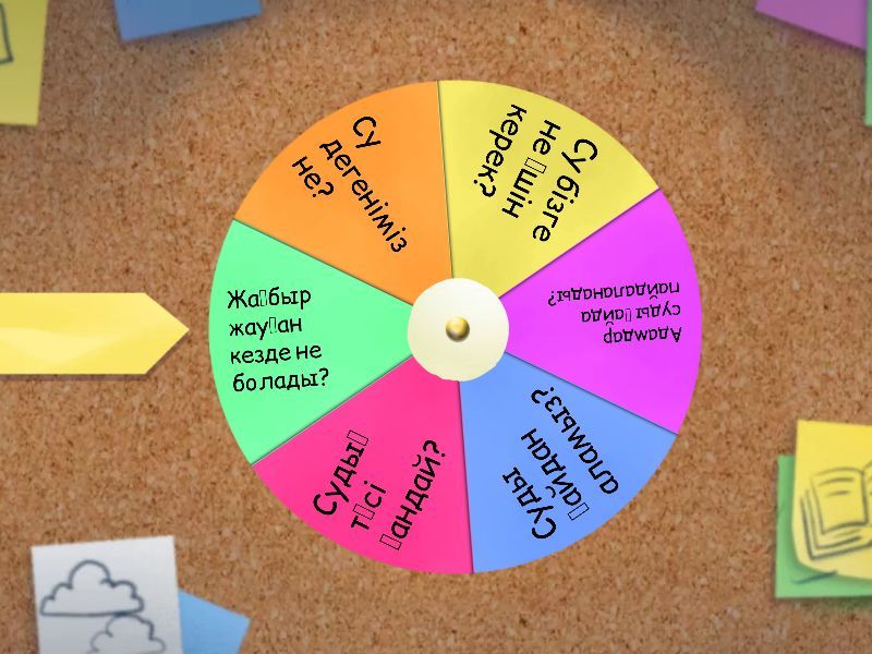 1) Су дегеніміз не? 2) Су бізге не үшін керек? 3) Адамдар суды қайда пайдаланады? 4) Суды қайдан аламыз? 5) Судың түсі қандай? 6) Жаңбыр жауған кезде не болады?