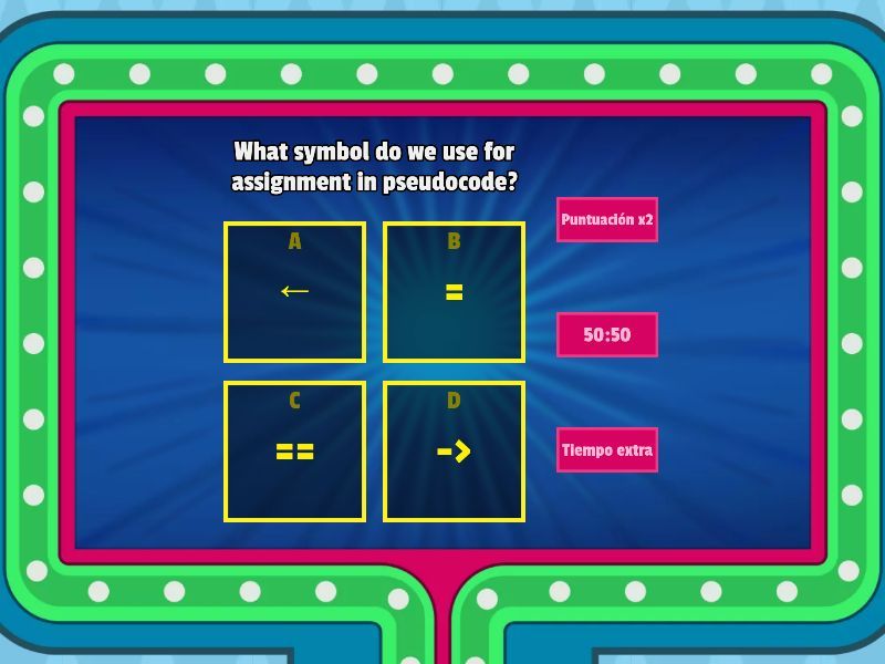 1) What symbol do we use for assignment in pseudocode? a) ← b) = c) == d) -> 2) Which is a correct variable name? a) score b) 2mark c) my mark d) mark% 3) Which line correctly stores the number 7? a) x ← 7 b) 7 ← x c) x =: 7 d) x == 7 4) Pseudocode is… a) a structured way to describe an algorithm in human language b) a real programming language c) secret computer code d) only pictures 5) A constant is… a) a value that does not change b) a value that always changes c) a random number d) the program name 6) Which input line is correct? a) INPUT age b) ENTER age() c) READ:age? d) SCAN{age}