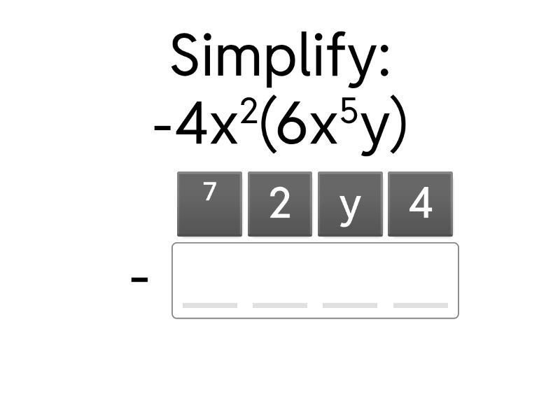 -24⁷y - Simplify: -4x2(6x5y), -36x⁴y⁶ - Simplify: 12x3y2(-3xy4), -35a⁷b³ - Simplify: -7a4b(5ab2), -18m⁶n⁴ - Simplify: 9m2n3(-2m4n), 30k⁷y³ - Simplify: 10k5(3k2y3), 32p⁵q⁶ - Simplify: 8p3q(4p2q5), To Get To The Other Side - Why Did The Chicken Cross The Road, -12r³s⁷ - -6r2s4(2rs3), -15x⁶y³ - 15x4y(-x2y2), 3x⁴y³ - 18x7y5/6x3y2,