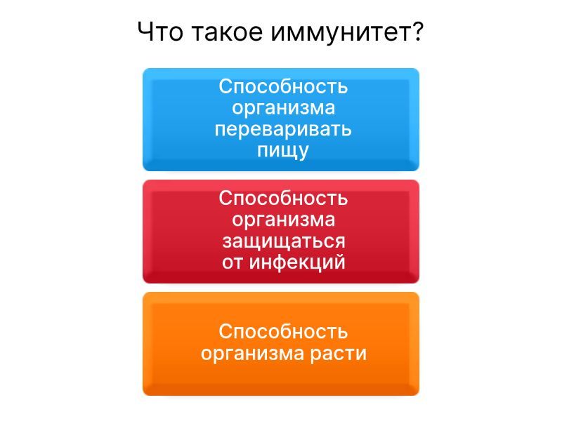 1) Что такое иммунитет? a) Способность организма переваривать пищу b) Способность организма защищаться от инфекций c) Способность организма расти 2) Какой иммунитет присутствует у человека с рождения? a) Приобретённый b) Пассивный c) Врожденный 3) Какой иммунитет формируется после перенесенного заболевания? a) Естественный активный b) Искусственный пассивный c) Искусственный активный 4) Какой иммунитет формируется после перенесенного заболевания? a) Естественный активный b) Искусственный пассивный c) Искусственный активный 5) Как называется иммунитет, передающийся ребёнку с молоком матери? a) Естественный активный b) Естественный пассивный c) Искусственный активный 6) Что вырабатывает организм для защиты от микробов? a) Витамины b) Гормоны c) Антитела 7) Какой иммунитет образуется при введении сыворотки (готовых антител)? a) Искусственный пассивный b) Искусственный активный c) Естественный активный 8) Что такое иммунологическая память? a) Способность организма забывать инфекции b) Способность организма запоминать возбудителей после встречи с ними c) Способность человека учить биологию 9) Какой орган является важной частью иммунной системы? a) Печень b) Сердце c) Лимфатические узлы 10) Для чего нужны вакцины? a) Для уничтожения микробов в организме b) Для формирования иммунитета без болезни c) Для быстрого роста