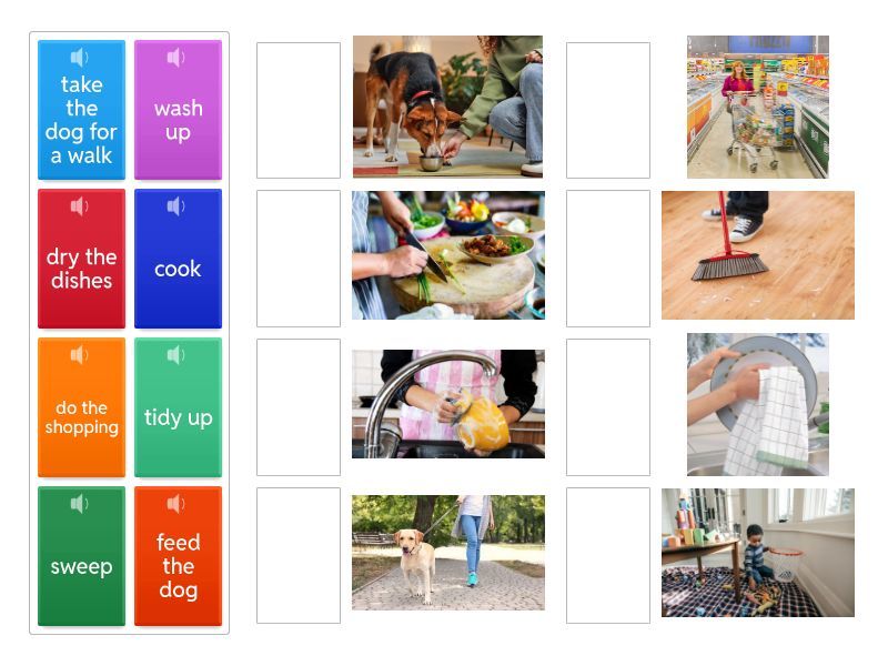 sweep, wash up, do the shopping, tidy up, cook, dry the dishes, take the dog for a walk, feed the dog,