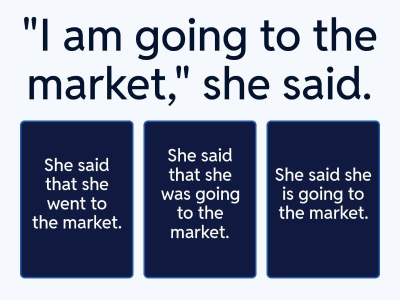 1) "I am going to the market," she said. a) She said that she went to the market. b) She said that she was going to the market. c) She said she is going to the market. 2) "We have finished our homework," they said. a) They said that they had finished their homework. b) They said they finished their homework. c) They said that they have finished their homework. 3) "I will call you tomorrow," he said. a) He said that he would call me the next day. b) He said he will call me tomorrow. c) He said that he called me tomorrow. 4) "I can swim," he said. a) He said that he swam. b) He said that he can swim. c) He said that he could swim. 5) "We are watching a movie," they said. a) They said that they are watching a movie. b) They said that they watched a movie. c) They said that they were watching a movie. 6) "She has been to Paris," he said. a) He said that she had been to Paris. b) He said that she went to Paris. c) He said she has been to Paris. 7) "I must finish this today," she said. a) She said that she must finish that that day. b) She said she finished this today. c) She said she must finish this today.