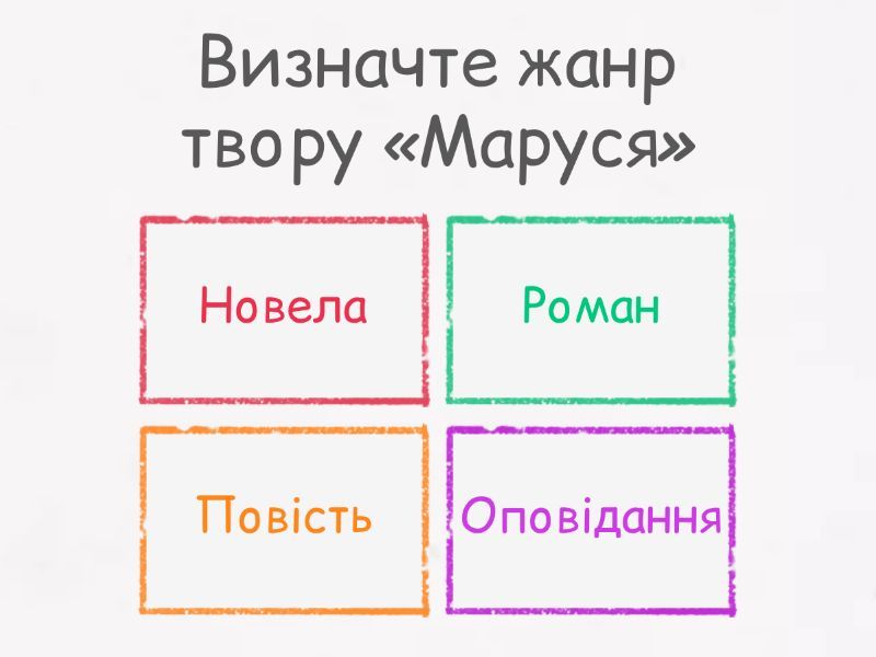1) Визначте жанр твору «Маруся» a) Новела b) Роман c) Повість d) Оповідання 2) Уперше Василь познайомився з Марусею a) у друзів b) на весіллі c) на ярмарку d) на вечорницях 3) Чим любила займатися Маруся? a) відвідувати церку b) Співати пісні c) Збирати гриби d) Господарювати по хаті 4) Чому Наум Дрот спочатку не дав дозволу на одруження Василя з Марусею? a) Він був сирота і бідний b) Його мали забрати в солдати c) Уже засватав іншу дівчину d) Був кріпаком 5) Твір «Маруся» Г. Квітки-Основ′яненка має ознаки… a) Романтизму b) Класицизму c) Реалізму d) Сентименталізму 6) Основний конфлікт твору має характер a) Психологічний b) Соціальний c) Національний d) Побутовий 7) Герой твору Г. Квітки-Основ′яненка «Маруся» Василь після смерті коханої стає… a) Солдатом b) Мандрівником c) Бурлакою d) Ченцем 8) Розв′язкою твору Г. Квітки-Основ′яненка «Маруся» є… a) Смерть Марусі b) Весілля Василя та Марусі c) Смерть Василя d) Відмова Наума видати дочку заміж 9) Який художній прийом ужито в характеристиці Марусі: «…веселенька, як весіння зіронька»? a) Метафора b) Порівняння c) Персоніфікація d) Епітет 10) Від чого захворіла Маруся з однойменної повісті Г. Квітки-Основ’яненка? a) Від страшної туги за Василем b) Отруїлася c) Пішла в ліс по гриби, потрапила під дощ d) Допомагала жебракам й інфікувалася від них невиліковною хворобою 11) Г. Квітка-Основ’яненко відомий як... a) Фундатор нової української прози b) Фундатор нової української поезії c) Автор першої новели в українській літературі d) Засновник романтизму 12) Справжнє прізвище письменника... a) Основ'яненко b) Квітка c) Рудченко d) Саксаганський