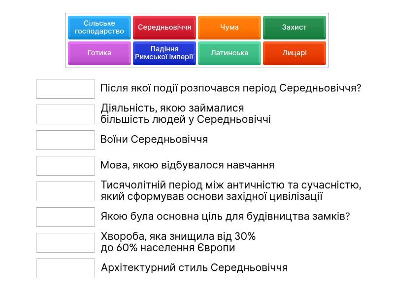 Середньовіччя - Тисячолітній період між античністю та сучасністю, який сформував основи західної цивілізації, Чума - Хвороба, яка знищила від 30% до 60% населення Європи, Латинська - Мова, якою відбувалося навчання, Лицарі - Воїни Середньовіччя, Готика - Архітектурний стиль Середньовіччя, Падіння Римської імперії - Після якої події розпочався період Середньовіччя?, Сільське господарство - Діяльність, якою займалися більшість людей у Середньовіччі, Захист - Якою була основна ціль для будівництва замків?,