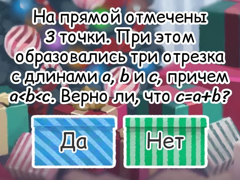 1) На прямой отмечены 3 точки. При этом образовались три отрезка с длинами a, b и c, причем a<b<c. Верно ли, что c=a+b? a) Да b) Нет 2) Луч OC делит тупой угол AOB на два угла. Верно ли, что хотя бы один из этих углов больше 45°? a) да b) нет 3) На прямой расположены три точки A, B, C. Известно, что AC < AB < BC. Какая из точек лежит между двумя другими? a) A b) B c) C 4) Луч OC — биссектриса неразвернутого угла AOB,луч ОD — биссектриса неразвернутого угла AOС. Определите, каким является ∠BOD? Если, ∠ВOC > 60° a) острым b) прямым c) тупым 5) На прямой отмечены три точки. Верно ли, что один из образовавшихся отрезков больше суммы двух других? a) да b) нет 6) Внутри неразвернутого угла с вершиной O проведены лучи OA и OB. Верно ли, что если угол AOB тупой, то данный угол также тупой? a) да b) нет 7) Луч OC делит неразвернутый угол AOB на два угла. Верно ли, что если угол  АОС - тупой, то угол АОВ - тупой? a) да b) нет