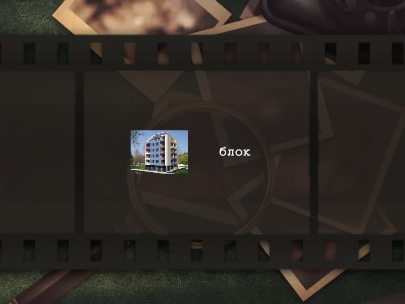 кино, училище, детска градина, улица, парк, църква, джамия, блок, аптека, болница, ресторант, пекарна, хотел, супермаркет, театър, пожарна, полиция.