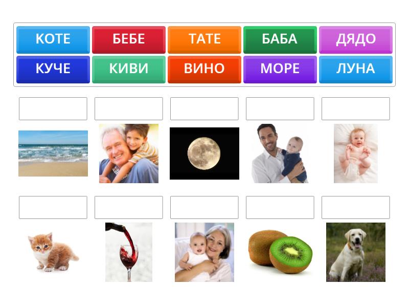 ЛУНА, МОРЕ, ВИНО, КИВИ, ТАТЕ, ДЯДО, БАБА, KOTE, КУЧЕ, БЕБЕ,
