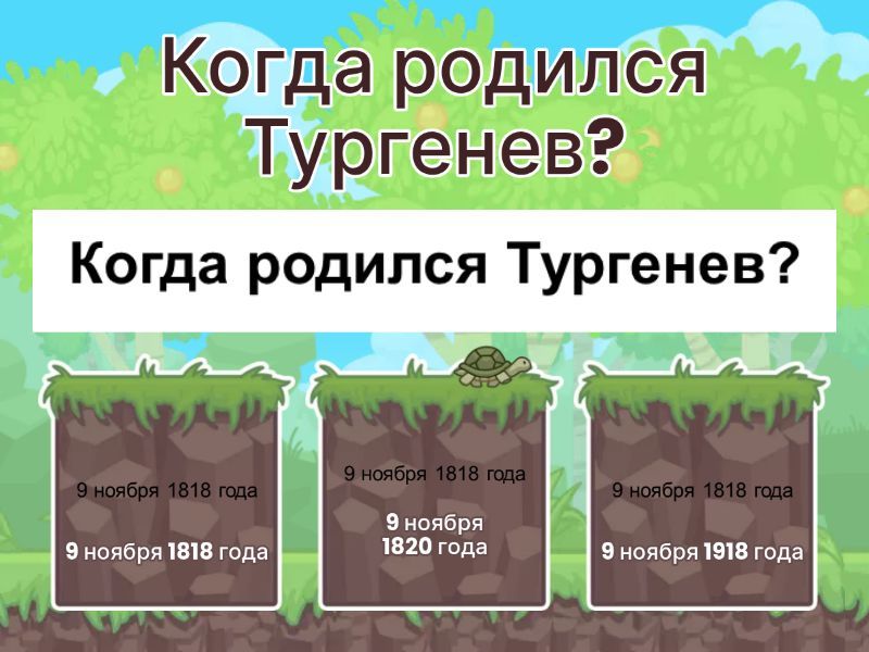 1) Когда родился Тургенев? a) 9 ноября 1818 года b) 9 ноября 1820 года c) 9 ноября 1918 года 2) Характер кого можно узнать в героинях произведений «Муму» и «Первая любовь»? a) Матери Тургенева b) Бабушки Тургенева c) Соседки Тургенева 3) В каком году Тургенев поступил на словесное отделение Московского университета? a) 1923 b) 1833 c) 1828 4) Кто опубликовал два стихотворения Тургенева в его студенческие годы без подписи в "Современнике"? a) Гончаров b) Чернышевский c) Плетнев 5) Какие события 1848 года отвратили Тургенева от радикальных идей? a) Французская революция b) Несчастная любовь c) Предательство друга 6) Кто написал статью «Когда же придёт настоящий день?» о романе Тургенева «Накануне»? a) Добролюбов b) Чернышевский c) Некрасов 7) Где жил Тургенев в 60-е годы? a) Москва b) Рим c) Баден-Баден 8) Где умер Тургенев? a) В России b) Во Франции c) В Германии 9) Где похоронили Тургенева? a) В России b) Во Франции c) В Германии 10) В каком году Тургенев написал роман «Отцы и дети»? a) 1861 b) 1961 c) 1572 11) Кого представляют «отцы» в романе «Отцы и дети»? a) Поколение шестидесятников, революционеры-демократы, носители новой философии b) Нигилистов c) Либералов-аристократов 12) Кто главные идейные противники в романе «Отцы и дети»? a) Базаров и Кирсанов b) Ситников и Кукшина c) Базаров и Кукшина 13) Про кого данное описание: нежные и белые руки, а в деревне он предпочитает одеваться с иголочки,по последней моде? a) Базаров b) Ситников c) Кирсанов 14) Про кого данное описание: красные обветренные руки, одет в балахон? a) Кирсанов b) Базаров c) Ситников 15) Какова дата основных действий в романе «Отцы и дети»? a) 20 мая 1859 года b) 20 июня 1859 года c) 10 мая 1859 года