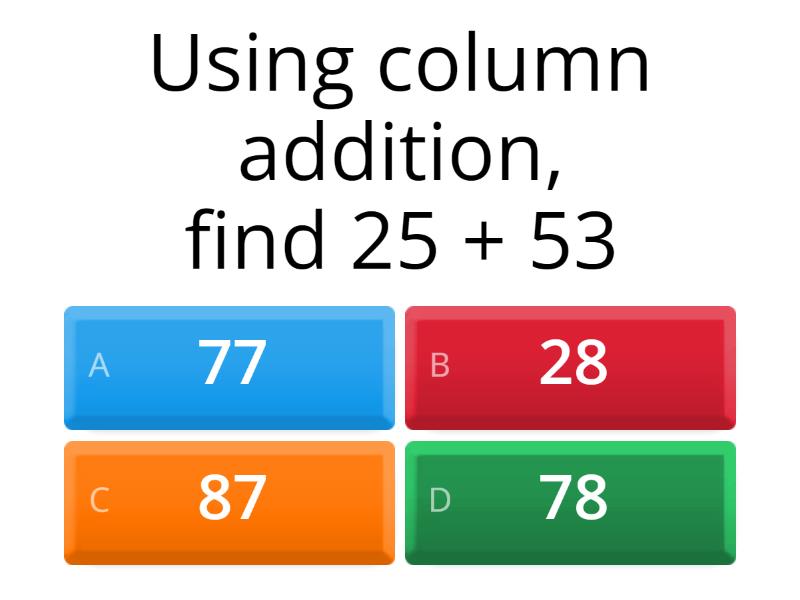 1) Using column addition, find 25 + 53 a) 77 b) 28 c) 87 d) 78 2) Using column addition, calculate 36 + 48 a) 714 b) 84 c) 75 d) 85 3) What is 67 - 22 a) 45 b) 47 c) 57 d) 55 4) In the number 21,594 which digit is in the hundreds column? a) 2 b) 1 c) 5 d) 9 e) 4 5) In the number 249.107 which digit is in the thousandths column? a) 2 b) 4 c) 9 d) 1 e) 0 f) 7 6) What is the value of the 8 in 18,602? a) Eight b) Eighty c) Eight hundred d) Eight thousand e) Eighty thousand 7) 56 +12 = 41 + 27 a) True b) False 8) 38 + 19 > 56 a) True b) False 9) Round 256 to the nearest 10 a) 250 b) 255 c) 260 d) 256.0 10) Round 3.542 to 2 decimal places a) 3.5 b) 3.54 c) 3.542 d) 3.55 11) What is 28 multiplied by 10? a) 280 b) 262 c) 288 d) 38 12) How many pennies are there in £1? a) 10 b) 50 c) 99 d) 100 13) What is 36 multiplied by 100? a) 360 b) 500 c) 3,600 d) 3636 14) What is 4.2 multiplied by 100? a) 420 b) 42 c) 56 d) 400 15) Estimate the answer to 4.2 x 2.8 a) 8 b) 12 c) 15 d) 10