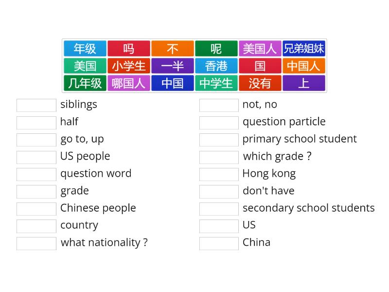 没有 - don't have, 兄弟姐妹 - siblings , 中学生 - secondary school students , 上 - go to, up, 年级 - grade , 香港 - Hong kong , 吗 - question word, 不 - not, no, 呢 - question particle , 小学生 - primary school student, 一半 - half , 国 - country , 中国 - China, 中国人 - Chinese people , 美国 - US , 美国人 - US people , 几年级 - which grade ?, 哪国人 - what nationality ?,