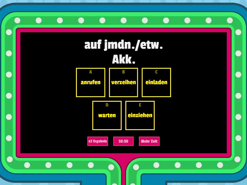 1) auf jmdn./etw. Akk. a) anrufen b) verzeihen c) einladen d) warten e) einziehen 2) jmdn Akk. a) beginnen b) anrufen c) helfen d) einladen e) einziehen 3) jmdm Dat. etw. Akk a) warten b) suchen c) verzeihen d) anrufen e) einziehen 4) (jmdn/etw. Akk) (nach jmdm/etw.Dat.) a) warten b) anrufen c) suchen d) einladen e) einziehen 5) jmdm. bei etw. Dat. a) warten b) verzeihen c) anrufen d) helfen e) einziehen 6) mit etw. Dat. a) beginnen b) warten c) einladen d) anrufen e) einziehen 7) jmdn. zu Dat. a) verzeihen b) helfen c) einladen d) anrufen e) einziehen 8) in etw. Akk a) verzeihen b) helfen c) einladen d) anrufen e) einziehen