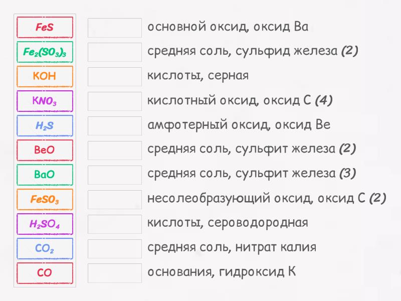 СО - несолеобразующий оксид, оксид С (2), СО2 - кислотный оксид, оксид С (4), КNO3 - средняя соль, нитрат калия, H2S - кислоты, сероводородная, H2SО4 - кислоты, серная, КОН - основания, гидроксид К, ВаО - основной оксид, оксид Ва, ВеО - амфотерный оксид, оксид Ве, FeS - средняя соль, сульфид железа (2), FeSO3 - средняя соль, сульфит железа (2), Fe2(SO3)3 - средняя соль, сульфит железа (3),