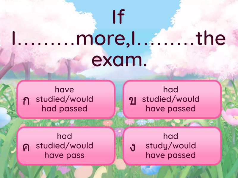 1) If I………more,I………the exam. a) have studied/would had passed b) had studied/would have passed c) had studied/would have pass d) had study/would have passed 2) Mark………me if he……..my cell number. a) would have phoned/hadn't lost b) should have phoned/hadn't lost c) Would had phone/had lost d) Would had phone/haven't lost 3) We………….a taxi if the public transport workers………. a) wouldn't had taken/haven't been b) Wouldn't have taken/hadn't been c) Wouldn't have take/hadn't been d) Wouldn't had take/hadn't been 4) Mom………….us the beach if it………… a) would had taken/haven't rain b) would had taken/hadn't rained c) wouldn't have taken/had no rained d) would have taken/hadn't rained 5) If I………….you were coming ,I…………you at the airport. a) had known/would have met b) had know/would have meet c) have known/would had meet d) have known/would had met 6) If I………..more careful, I………….so many mistakes. a) have been/would had made b) had been/wouldn't have made c) had been/would have made d) have been/wouldn't had made 7) I…………them present if they…………me to their wedding. a) wouldn't had bought/have invited b) would have bought/had invited c) Wouldn't have bought/had invited d) would had bought/have invitad 8) If Emma………….up earlier, she………….the train. a) had got/would have reached b) had gotten/would have reached c) have get/would had reach d) had get/would have reached 9) If I…………shopping, what…………………..? a) hadn't gone/would you have eaten b) haven't gone/would you have eat c) hadn't gone/wouyou have eating d) had gone/would you have eat 10) If you…………..the fine, you…………..to prison. a) you had paid/wouldn't had been b) you had paid/wouldn't have been c) you had pay/wouldn't have been d) you had pay/wouldn't had been