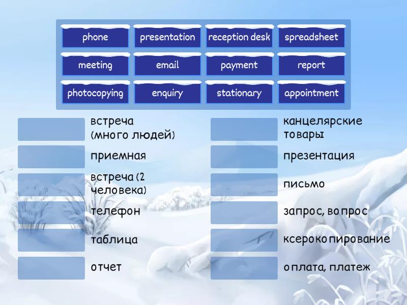 appointment - встреча (2 человека), meeting - встреча (много людей), photocopying - ксерокопирование, report - отчет, email - письмо, payment - оплата, платеж, presentation - презентация, spreadsheet - таблица, enquiry - запрос, вопрос, phone - телефон, reception desk - приемная, stationary - канцелярские товары,