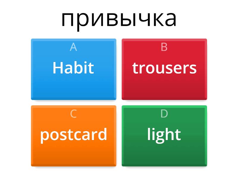 1) привычка a) Habit b) trousers c) postcard d) light 2) вешать телефонную трубку a) stressed b) climate c) hang up d) joke 3) каблуки a) high heels b) cool c) long sleeved d) calm 4) шутка a) high heels b) Habit c) long sleeved d) joke 5) джемпер a) jumper b) light c) shoes d) Habit 6) легкий a) short sleeved b) climate c) Habit d) light 7) плащ a) jacket b) raincoat c) hang up d) calm 8) рубашка a) shirt b) temperature c) postcard d) cool 9) туфли a) jumper b) it's fun c) sweater d) shoes 10) брюки a) short sleeved b) joke c) trousers d) raincoat 11) Пляж a) sunbathe b) beach c) Habit d) sweater 12) открытка a) postcard b) light c) shoes d) wear 13) загорать a) sunbathe b) cool c) northwest d) stressed 14) весело a) high heels b) trousers c) it's fun d) suit 15) спокойный a) hang up b) joke c) calm d) shirt 16) климат a) sweater b) light c) shirt d) climate 17) прохладный a) jumper b) cool c) sunbathe d) wear 18) куртка a) calm b) postcard c) jacket d) wear 19) грустный a) sad b) shirt c) joke d) temperature 20) напряжённый a) cool b) stressed c) high heels d) postcard 21) короткие рукава a) long sleeved b) high heels c) calm d) short sleeved 22) длинные рукава a) long sleeved b) sweater c) jacket d) shirt 23) свитер a) sweater b) stay c) skirt d) postcard 24) северо-запад a) northwest b) jacket c) joke d) beach 25) температура a) long sleeved b) sad c) temperature d) stressed 26) костюм a) suit b) temperature c) trousers d) jacket 27) юбка a) postcard b) skirt c) it's fun d) sunbathe 28) Носить a) jacket b) wear c) hang up d) stressed 29) Оставаться a) hang up b) cool c) stay d) jumper