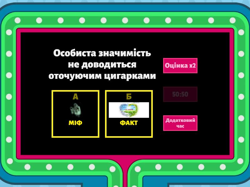 1) Особиста значимість не доводиться оточуючим цигарками a) МІФ b) ФАКТ 2) Трав’яні цигарки на сумішах – безпечна альтернатива звичайним шкідливим сигаретам a) МІФ b) ФАКТ 3) Електронні цигарки не зменшують інтенсивності куріння a) МІФ b) ФАКТ 4) Дівчина, що курить виглядає привабливо / Хлопець, що курить, виглядає мужньо a) МІФ b) ФАКТ 5) Куріння – чудовий метод для схуднення/ Відмова від куріння призводить до набору ваги a) МІФ b) ФАКТ 6) Небажання відмовитись від паління свідчить про незрілість (підліток), або необізнаність дорослої людини про шкоду паління a) МІФ b) ФАКТ 7) Куріння – це свобода від нав’язаних суспільством норм та правил a) МІФ b) ФАКТ 8) Пасивне куріння - нешкідливе a) МІФ b) ФАКТ 9) Паління, це – жовті зуби, тьмяна шкіра, ламкі нігті, неприємний запах із ротової порожнини... a) МІФ b) ФАКТ 10) Дим від цигарок містить величезну кількість шкідливих сполук a) МІФ b) ФАКТ 11) Якщо я не буду сильно затягуватися, то куріння мені не нашкодить a) МІФ b) ФАКТ 12) У курців розвивається не лише психологічна, але й нікотинова залежність a) МІФ b) ФАКТ 13) Трав’яні цигарки становлять серйозну загрозу для здоров’я a) МІФ b) ФАКТ 14) Куріння допомагає зосередитися a) МІФ b) ФАКТ 15) Усі цигарки однаково шкідливі a) МІФ b) ФАКТ 16) Пасивне куріння дуже шкідливе a) МІФ b) ФАКТ 17) «Легкі» чи ароматизовані цигарки менш шкідливі, ніж звичайні a) МІФ b) ФАКТ 18) Нікотин має збуджувальний ефект на нервову систему a) МІФ b) ФАКТ 19) Після багатьох років куріння кидати вже пізно a) МІФ b) ФАКТ 20) Відмовлятися від куріння потрібно, незалежно від віку та стажу куріння a) МІФ b) ФАКТ 21) Чи лише дорогі цигарки/ сигари підкреслюють високий соціальний статус? a) МІФ b) ФАКТ 22) Низький апетит курця пов’язаний із розладами травної системи a) МІФ b) ФАКТ 23) Цигарка не є «чарівною паличкою», яка робить курця цікавим у спілкуванні a) МІФ b) ФАКТ 24) Без професійної допомоги, менше 7% людей, можуть кинути палити a) МІФ b) ФАКТ 25) Електронні цигарки – ефективний спосіб кинути палити a) МІФ b) ФАКТ 26) Куріння допомагає у соціальних взаємодіях a) МІФ b) ФАКТ 27) Цигарки допомагають розслабитись a) МІФ b) ФАКТ