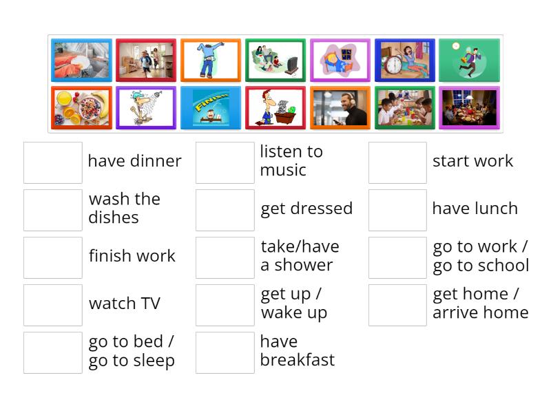 get up / wake up, have breakfast, have lunch, have dinner, go to work / go to school, get home / arrive home, wash the dishes, listen to music, watch TV, go to bed / go to sleep, finish work, start work, take/have a shower, get dressed,