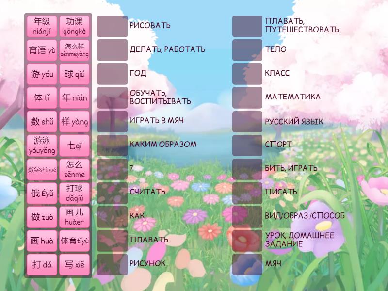 游 yóu - ПЛАВАТЬ, ПУТЕШЕСТВОВАТЬ, 年级 niánjí - КЛАСС, 数 shǔ - СЧИТАТЬ, 球 qiú - МЯЧ, 画 huà - РИСОВАТЬ, 写 xiě - ПИСАТЬ, 俄 Éyǔ - РУССКИЙ ЯЗЫК, 游泳 yóuyǒng - ПЛАВАТЬ, 育语 yù - ОБУЧАТЬ, ВОСПИТЫВАТЬ, 功课 gōngkè - УРОК, ДОМАШНЕЕ ЗАДАНИЕ, 怎么样 zěnmeyàng - КАКИМ ОБРАЗОМ, 打 dá - БИТЬ, ИГРАТЬ, 怎么 zěnme - КАК, 样 yàng - ВИД/ОБРАЗ /СПОСОБ, 做 zuò - ДЕЛАТЬ, РАБОТАТЬ, 年 nián - ГОД, 体 tǐ - ТЕЛО, 打球 dǎqiú - ИГРАТЬ В МЯЧ, 七qī - 7, 体育tǐyù - СПОРТ, 数学shùxué - МАТЕМАТИКА, 画 儿 huàer - РИСУНОК,