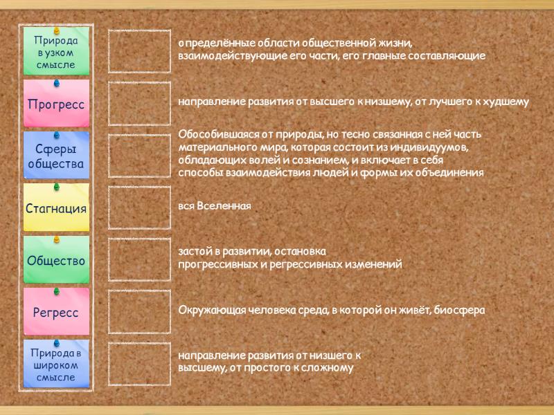 Общество - Обособившаяся от природы, но тесно связанная с ней часть материального мира, которая состоит из индивидуумов, обладающих волей и сознанием, и включает в себя способы взаимодействия людей и формы их объединения, Природа в узком смысле - Окружающая человека среда, в которой он живёт, биосфера, Природа в широком смысле - вся Вселенная, Сферы общества - определённые области общественной жизни, взаимодействующие его части, его главные составляющие, Прогресс - направление развития от низшего к высшему, от простого к сложному, Регресс - направление развития от высшего к низшему, от лучшего к худшему, Стагнация - застой в развитии, остановка прогрессивных и регрессивных изменений,