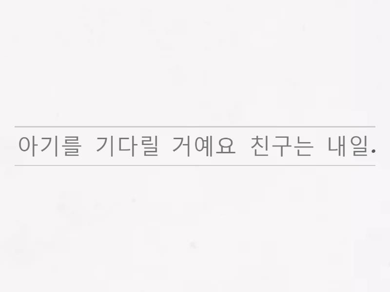 친구는 내일 아기를 기다릴 거예요., 오빠는 내일 식당에서 저를 기다릴 거예요., 지민이는 어제 고모를 기다렸어요?, 저는 어제 사촌을 기다리지 않았어요., 저는 오늘 서점에서 친구를 기다리고 있어요., 친구는 내일 선생님을 기다릴 거예요., 오빠는 내일 운동장에서 저를 기다릴 거예요., 지민이는 어제 이모를 기다렸어요?, 저는 어제 친구를 기다리지 않았어요., 지민이는 어제 할아버지를 기다렸어요?,