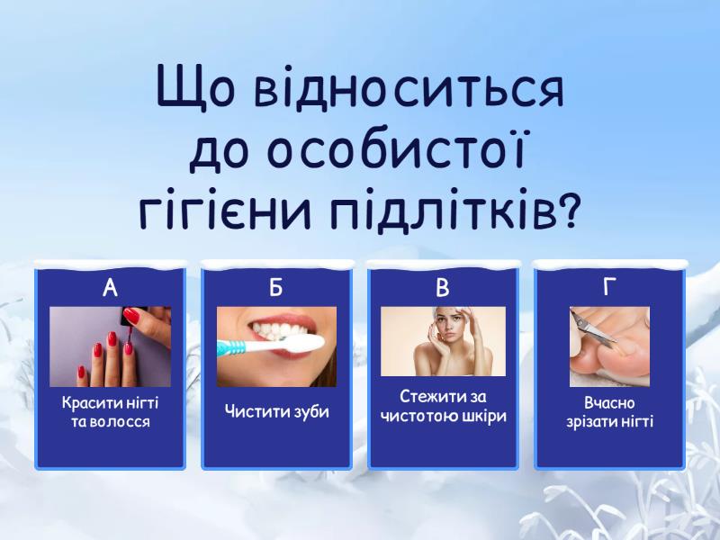 1) Що відноситься до особистої гігієни підлітків? a) Красити нігті та волосся b) Чистити зуби c) Стежити за чистотою шкіри d) Вчасно зрізати нігті 2) Що впливає на організм людини? a) Погане харчування b) Недостатня кількість вітамінів c) Шкідливі звички d) Різноманітне і збалансоване харчування 3) Мийтеся щодня теплою водою з ... a) Мило b) Гелем для душу c) Олією d) Порошок 4) Щодня одягайте чисту білизну, шкарпетки або колготки. Якщо білизна забруднилася протягом дня треба: a) Замінити її b) Носити і надали 5) Щоб шкіра завжди буде гарною треба: a) Вживати більше свіжих овочів і фруктів, пийте багато молока b) Вживати солодощі та різні напої 6) Чому гуляючи в лісі або полі, не можна торкайтися незнайомих рослин? a) Вони можуть виявитись отруйними b) Можуть спричинити подразнення шкіри c) Щоб руки були чисті 7) Здорові нігті мають опуклу форму, гладеньку блискучу поверхню та рожевий колір. a) Так b) Ні 8) Під нігтями можуть скупчуватися безліч бактерій a) Так b) Ні 9) Який вигляд має чисте й здорове волосся? a) М'яке, еластичне b) Має природний блиск c) Сплутане та жирне 10) Якщо не доглядати за волоссям, воно стає: a) Жирним та сплутаним b) Має неприємний запах c) Має природний блиск 11) Чи повинен одяг бути зручним, легким і теплим? a) Так b) Ні 12) Як треба доглядати за одягом? a) Слід регулярно прати b) Прати один раз на місяць c) Віддавати в хімчистку 13) Нижню білизну потрібно міняти: a) Один раз на місяць b) Щодня c) Один раз на тиждень 14) Вибір взуття: a) Взуття треба підбирати по нозі b) Взуття повинно бути більше за розміром c) Воно має бути зручним і теплим 15) Як правильно доглядати за ротовою порожниною? a) Чистити зуби потрібно двічі на день - вранці та ввечері b) Чистити зуби потрібно один раз на день c) Чистити зуби двічі на місяц 16) Щоб уникнути утворення прищів рекомендується: a) Їсти менше фруктів і овочів b) Багато часу перебувати на свіжому повітрі і на сонці c) Додержувати вимог особистої гігієни 17) Свіжі овочі і фрукти допомагають підтримувати здоров'я всього організму, включно зі шкірою: a) Так b) Ні 18) Що входить в раціональне харчування? a) Овочі та фрукти b) Білки та злаки c) Вуглеводи і жири 19) Як збалансувати свій раціон? a) Включіть у раціон різноманітні продукти b) Більше вуглеводів, цукру та солі c) Пити достатньо води d) Обмежити споживання цукру та солі 20) Вважається, що сніданок - це найважливіший прийом їжі, адже він дає енергію на весь день. a) Так b) Ні