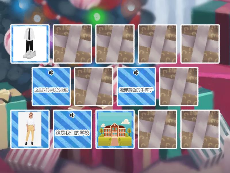 这是我们的学校 , 这是我们学校的校服 , 她穿黄色的牛裤子 , 她穿绿色的汗衫 , 他穿灰色外套 , 我妹妹喜欢粉红色和红色毛衣 , 我姐姐有红色的大衣 ,
