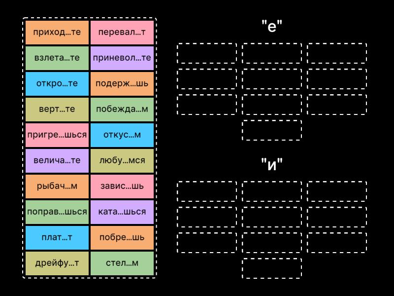 "е": откро...те, дрейфу...т, стел...м, пригре...шься, велича...те, любу...мся, побежда...м, ката...шься, побре...шь, взлета...те, "и": плат...т, приход...те, приневол...те, подерж...шь, завис...шь, откус...м, перевал...т, поправ...шься, верт...те, рыбач...м,